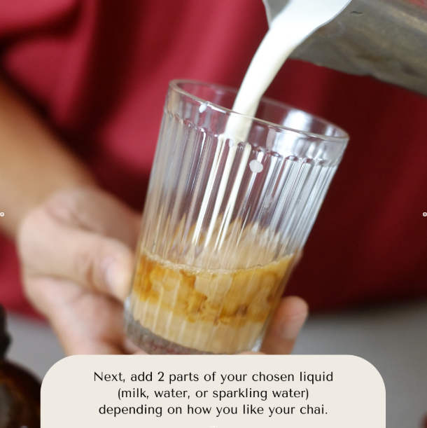 - 1:2 - For every 1 part of chai, mix 2 parts of base (water, milk, or soda)